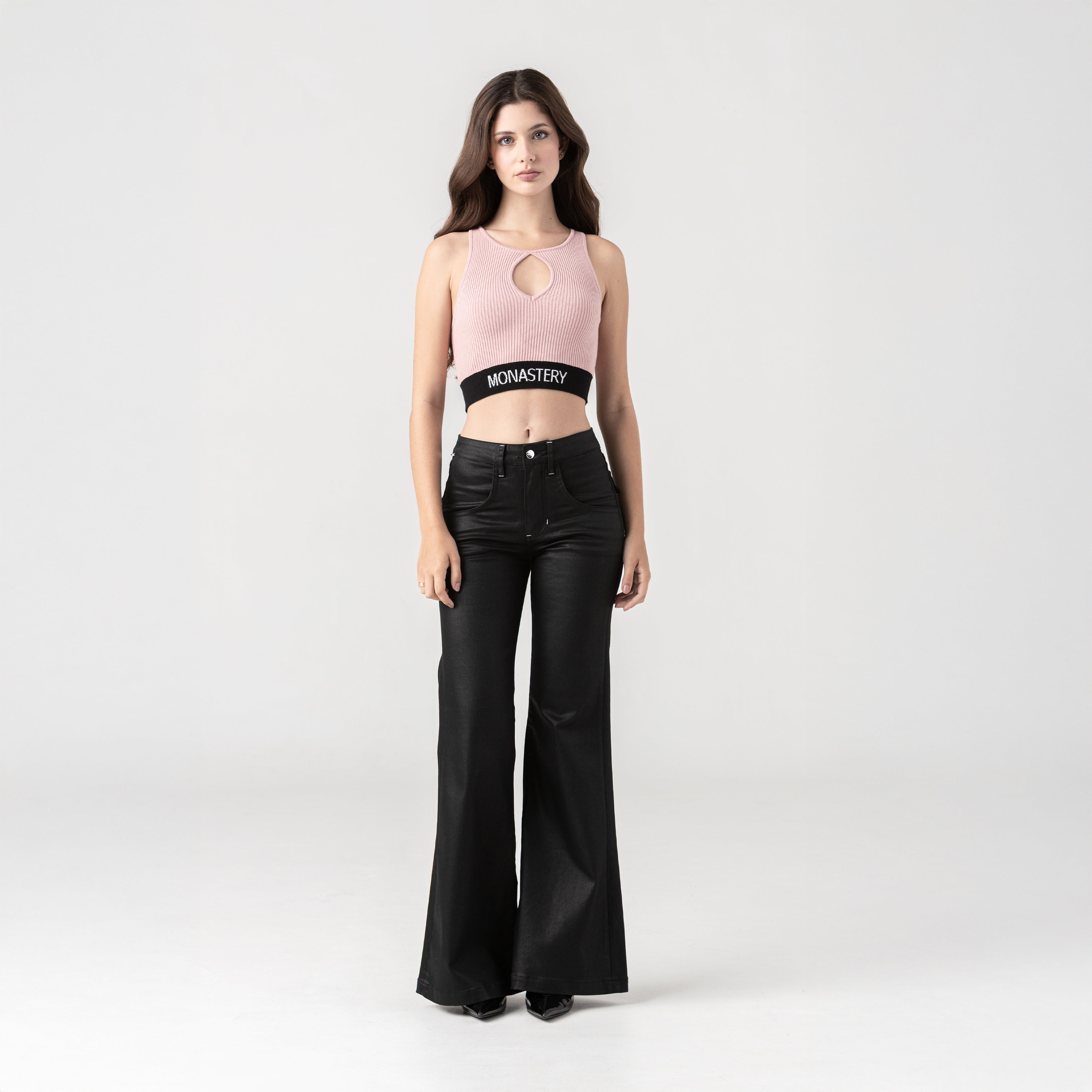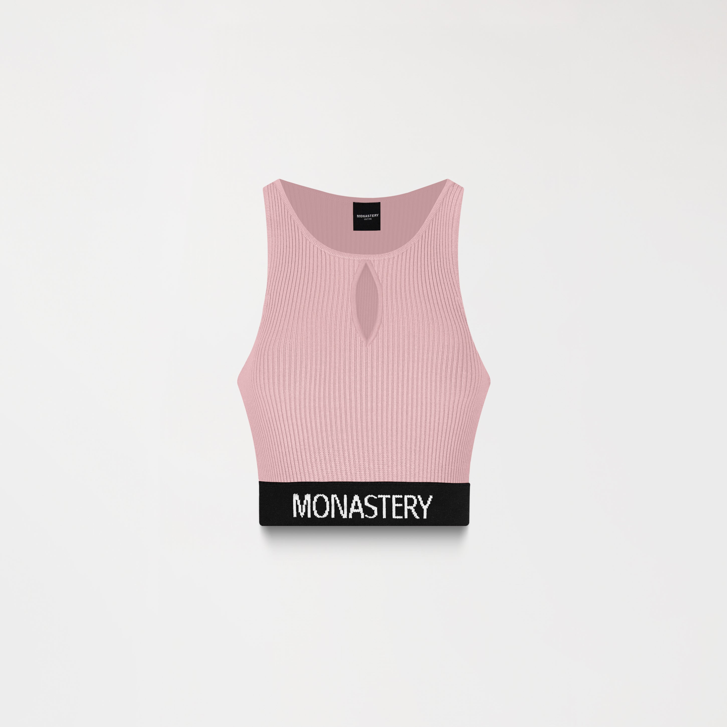 A feminine top crafted in an exclusive Monastery fabric, designed to stand out, combining a woven structure with a figure-flattering front neckline. The elastic waistband, visible on both sides of the garment, incorporates the Monastery logo as a distinctive seal of identity. On the back, the signature logo is embroidered using a flat technique, providing contrast and character. This garment is designed for those seeking a balance between shape, presence, and subtle design.