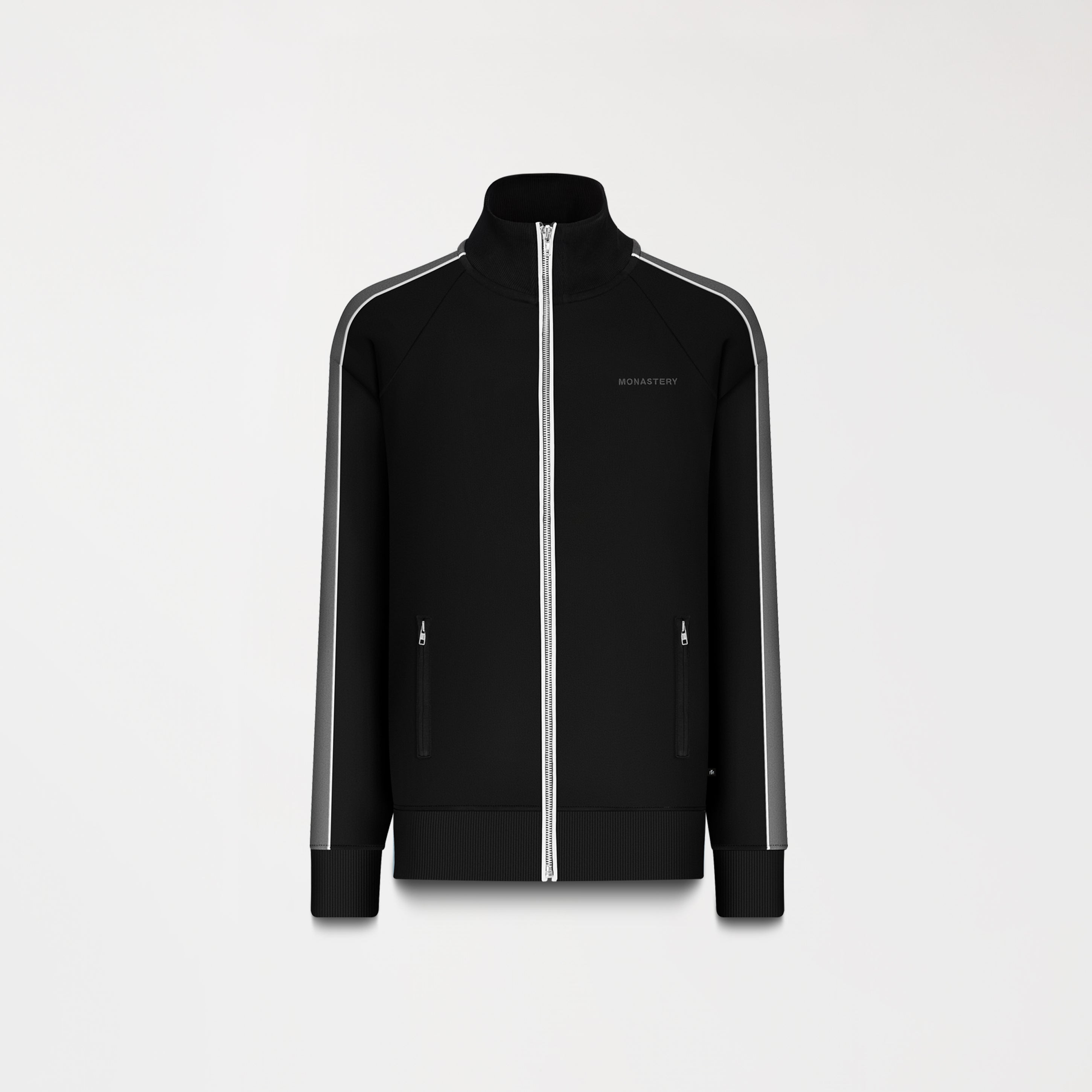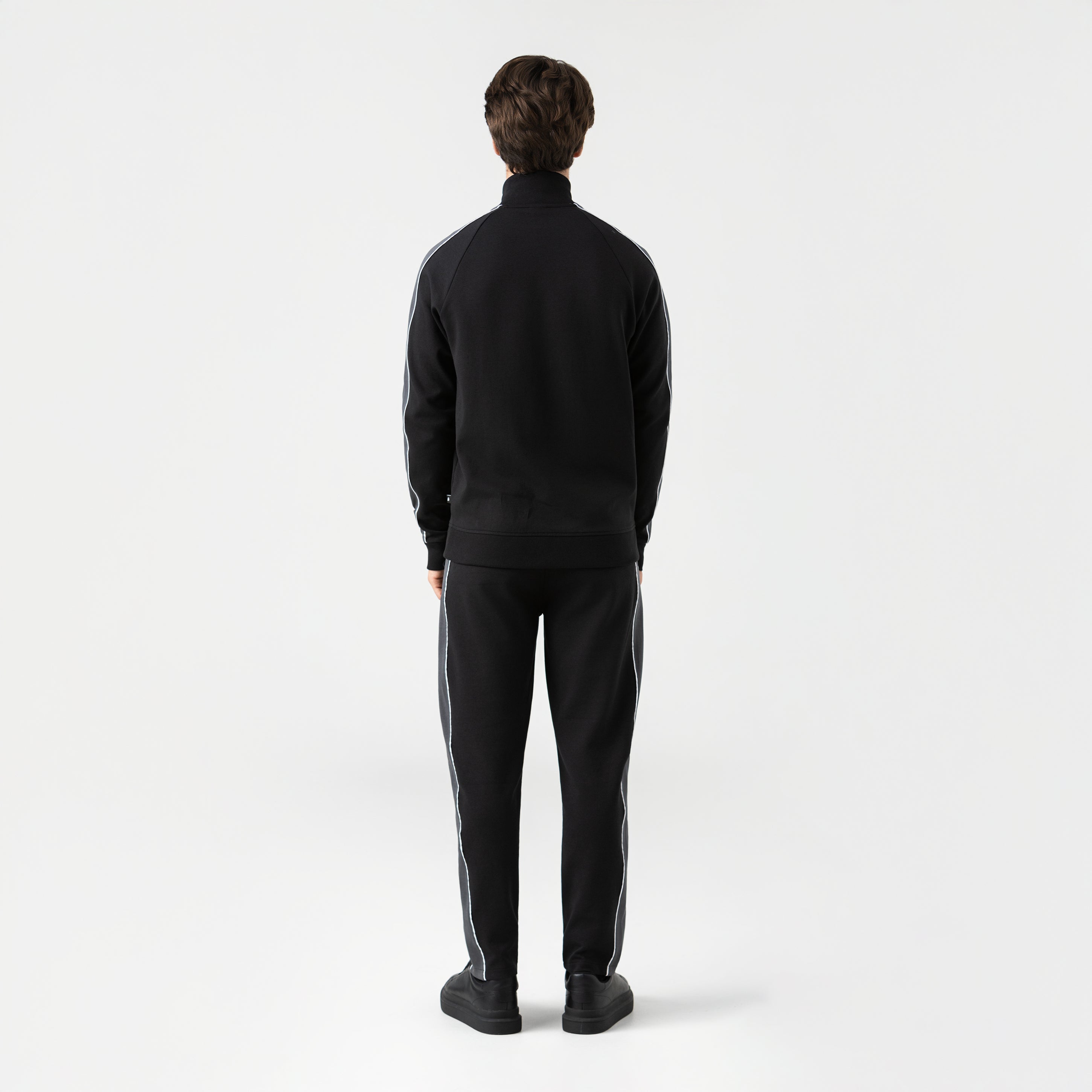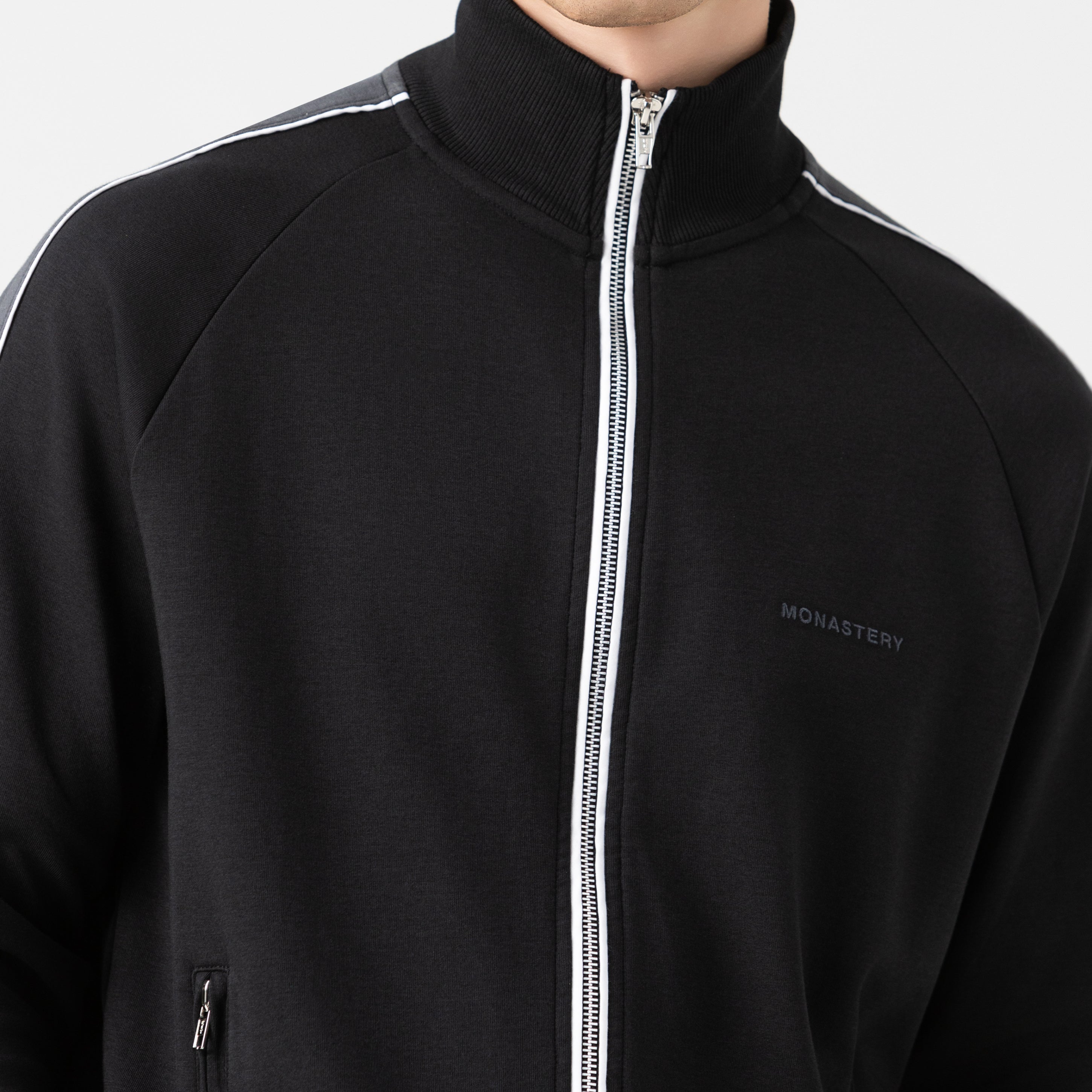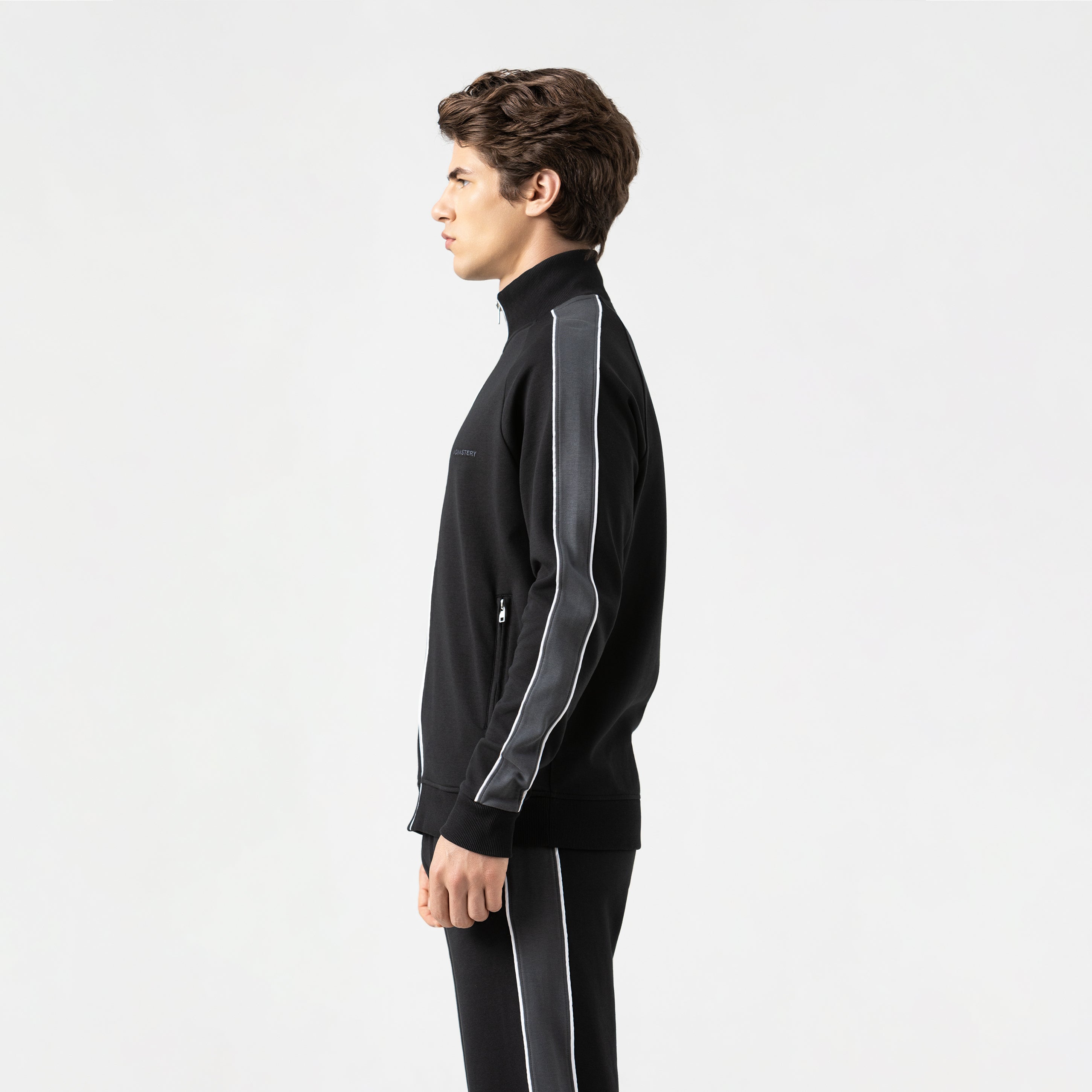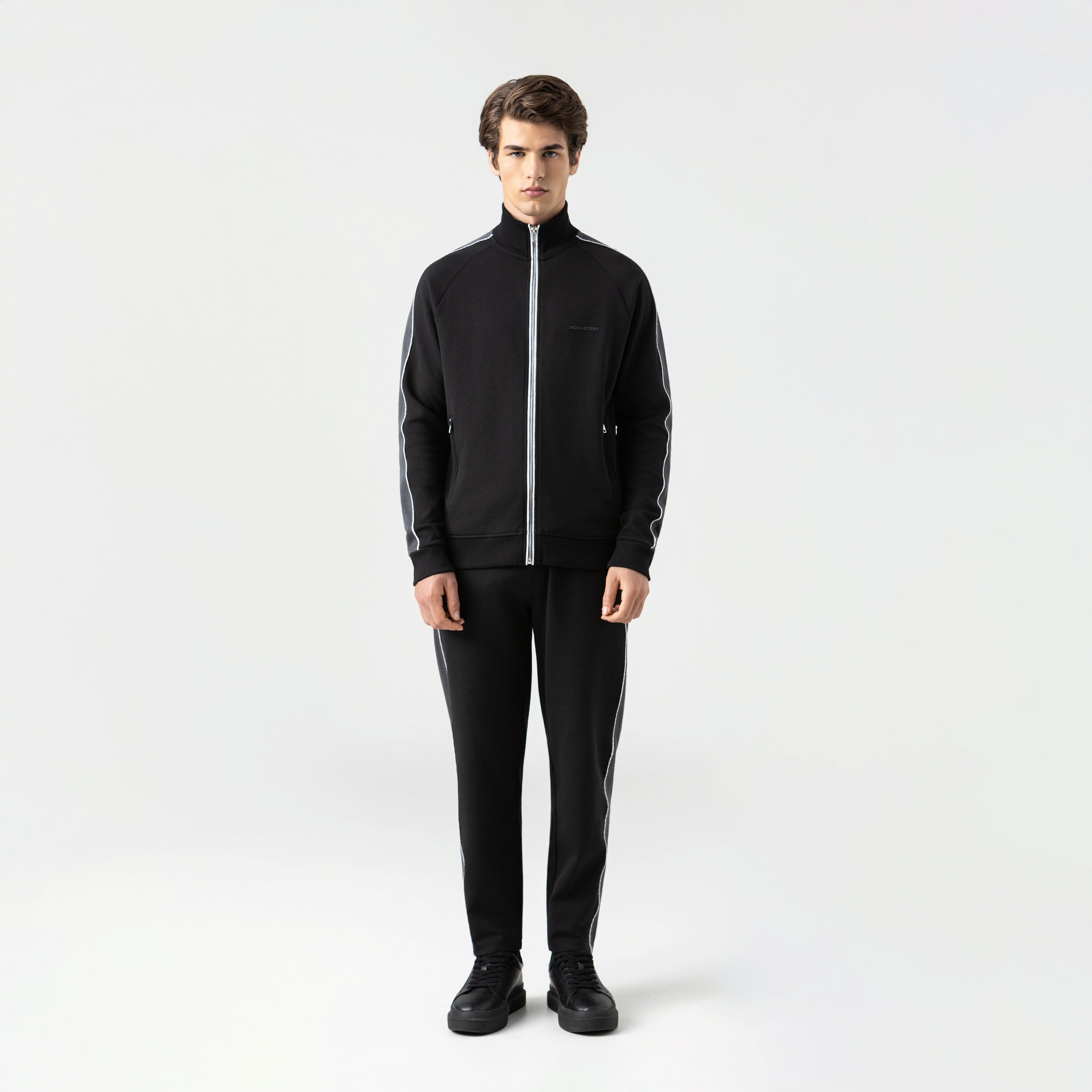 Tormain is a jacket and jogger set in double-faced knit fabric offering a regular silhouette that balances comfort and elegance. The jacket includes zippered pockets, an embroidered Monastery logo, and a high-density print on the back that adds a subtle yet unmistakable character, while contrasting piping enhances the structure of the set. The jogger includes a contrasting drawstring and back pockets. Each detail has been carefully counter-marked, reaffirming our commitment to excellence and authenticity in design. Ideal for occasions that demand a casual yet sophisticated appearance.